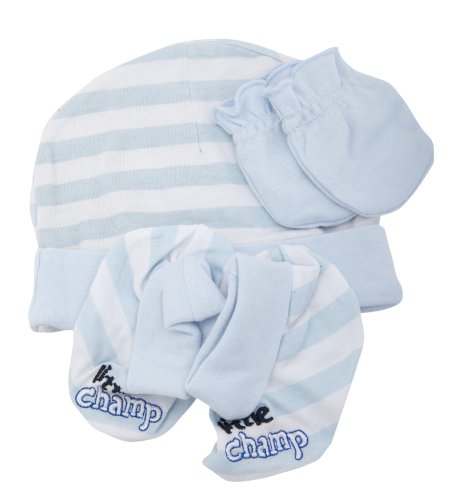 Baby Boy Little Champ Design Embroidered Hat, Mittens and Booties Gift Set (Newborn) (Blue and White)