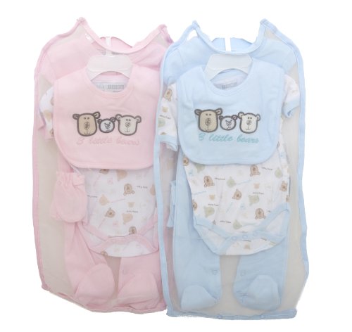 Baby 4 Piece Gift Set, Bears Design Baby Mittens, Sleepsuit, Bodysuit and Bib Gift Set (0-3 Months) (Pink)