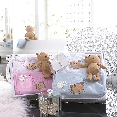 appliqued bib, keepsake trinket bag and is complemented by a soft cuddly