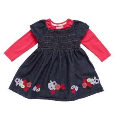 This set from the stylish range of baby girl clothes by Rocha. Little Rocha comes with a denim dress, which fastens with buttons at the centre back of the neck and features short raglan sleeves, a square neck and a stretchy smocked top with multicolour embroidery, which matches the multicolour embroidered flowers adorning its skirt. The pink bodysuit features a crew neck, long sleeves and poppers along the crotch.