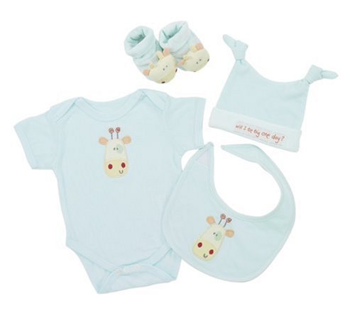 This 4 piece gift set includes a 3 6 months bodysuit, hat, pair of booties and a bib, all are in pale blue and show the will I be big giraffe. Booties are in velour with a cotton inner and have the padded giraffe on the front The bodysuit has the embroidered giraffe on the front 3-6 months 100 cotton The knotted hat has the will I be big logo 3-6 months 80 cotton 20 polyester The bib has the embroidered giraffe on the front and is 100 cotton All items are machine washable at 40DG