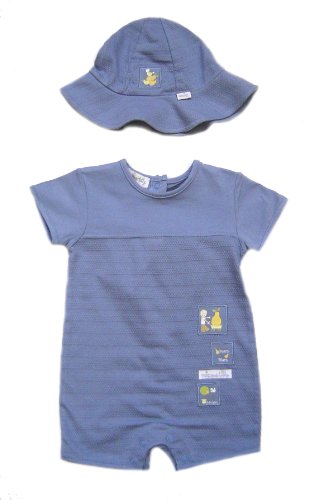 Romper and matching hat set made from soft textured knit cotton jersey. There are appliqued squares on the left which have Max with his pears printed on them with a matching applique square on the hat. Great for the summer and as a gift.
