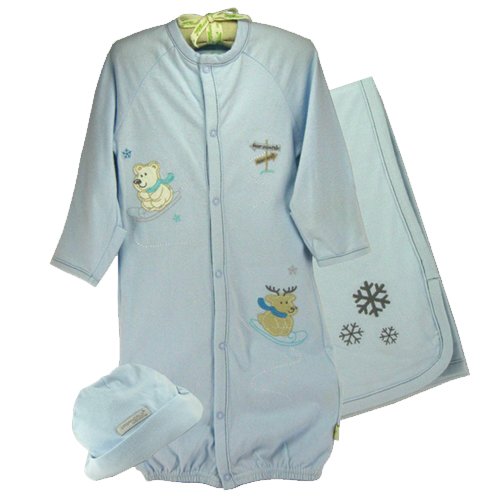 Adorable "winter patterned" 3 piece set with embroidered fall and winter characters. Includes gown, blanket, and hat! Free of toxins and chemicals to keep your baby safe, and softer than ever before. Comes with decorative padded hanger and 100% cotton guaranteed. You will feel good buying, your baby will feel good wearing it! Makes a wonderful gift as well!