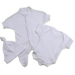 This is a set comprising of 1 sleepsuit with popper fasteners down the legs, 1 envelope neck bodysuit with poppers at the bottom and a knotted hat all in plain white. They are quality garments made from 100% Cotton, machine washable at 40 degrees and manufactured in our own factory in the UK. Free UK delivery. All orders received before 12pm Mon to Fri are despatched the same day (except Bank Holidays). Available in sizes Prem 0 (upto1.5lb (0.7kg), Prem 1 (1.5-3.5lb) & Prem 2 (3.5-5.5lb) .