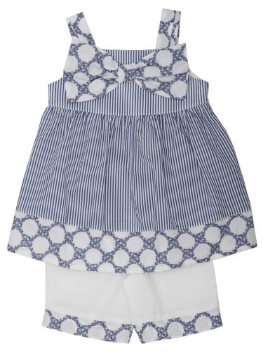 Two part cotton set in classic blue and white colours with polka dot bow and border detail.