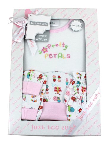 Gift set for baby girls comprising sleeveless t-shirt, hat, mittens and a pair of bootees. Presented in a box.