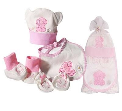4 Piece Baby Gift Set - Pink 4 Piece Baby Girl Gift Set in soft candy pink/white. Includes: Hat, Mitts, Booties and Bib in Decorative Bag. Ideal gift for welcoming that new arrival! 100% Cotton