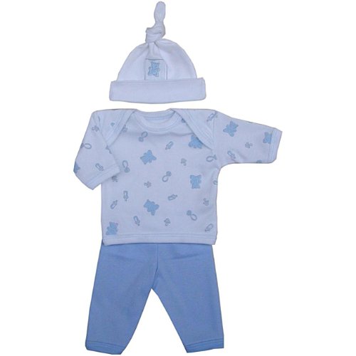 This is a lovely set comprising of a long sleeved envelope neck top in white printed with a blue teddy design, matching knotted hat and a co-ordinating pair of sky blue trousers with elasticated waist. They are quality garments made from 100% Cotton, machine washable at 40 degrees and manufactured in our own factory in the UK. Free UK delivery. All orders received before 12pm Mon to Fri are despatched the same day (except Bank Holidays). Available in sizes Prem 1 (1.5-3.5lb),Prem 2 (3.5-5.5lb) & Prem 3 (5.5-7.5lb).