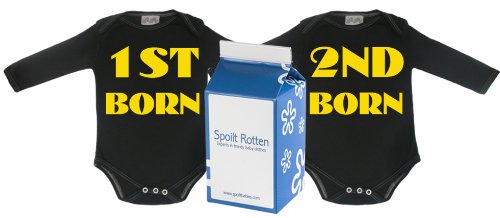 Spoilt Rotten - 1st Born And 2nd Born Twin Set Babygrows / Bodysuit Alternative Baby Clothes 100% Organic Sizes 0-6 months WHITE/BLACK + in funky Milk Carton