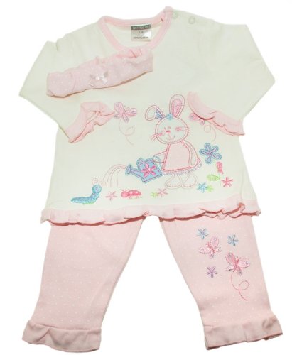 Baby Girl Embroidered Bunny Design T-Shirt & Pink Bottoms Set with Hair Band (Cream) (9 months) (Cream)