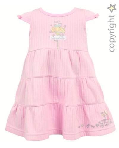 This pretty tiered dress will look lovely on little girls. It has capped sleeves with bows clip studs down the centre back for easy changing and each tier of the skirt is gathered onto the next. It is made from a soft drop needle fabric and has a print of a butterfly sitting on a flower at the top and Tilly in her playground printed on the bottom left side of the dress.