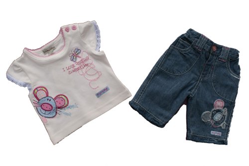The T-shirt has in soft cream colour has pretty frills on sleeves and neckline, and embroidered cute mouse motif in girly colours The soft denims have soft elasticated waist with frilly hems