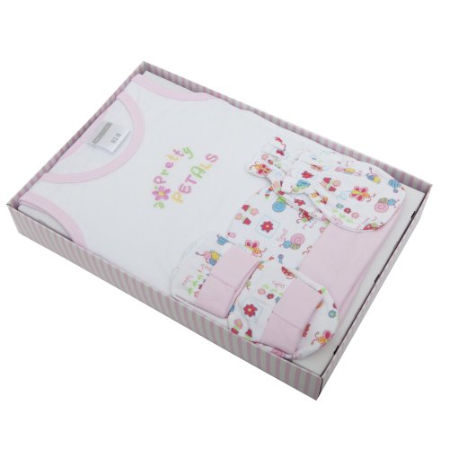 4 piece gift set includes: 1 x baby t-shirt, 1 x baby mittens, 1 x baby hat and 1 x baby booties.